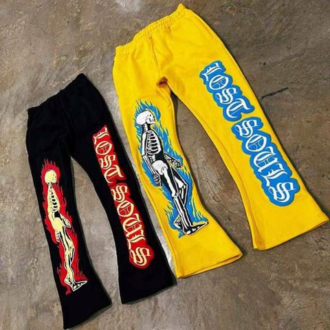 ストリートウェアメンズズボンカジュアルソリッドジョガースウェットパンツカスタムスケルトン3Dパフプリントフリーススタック付きフレアパンツ男性用